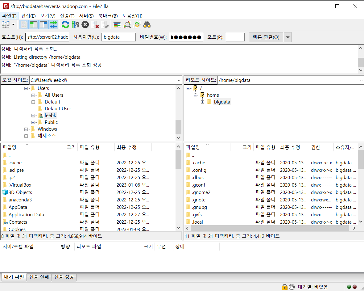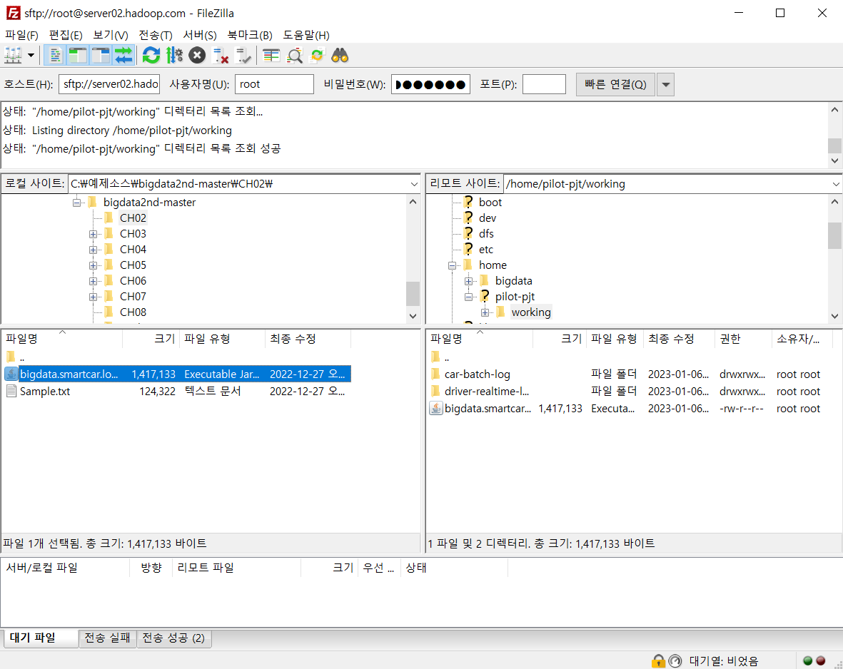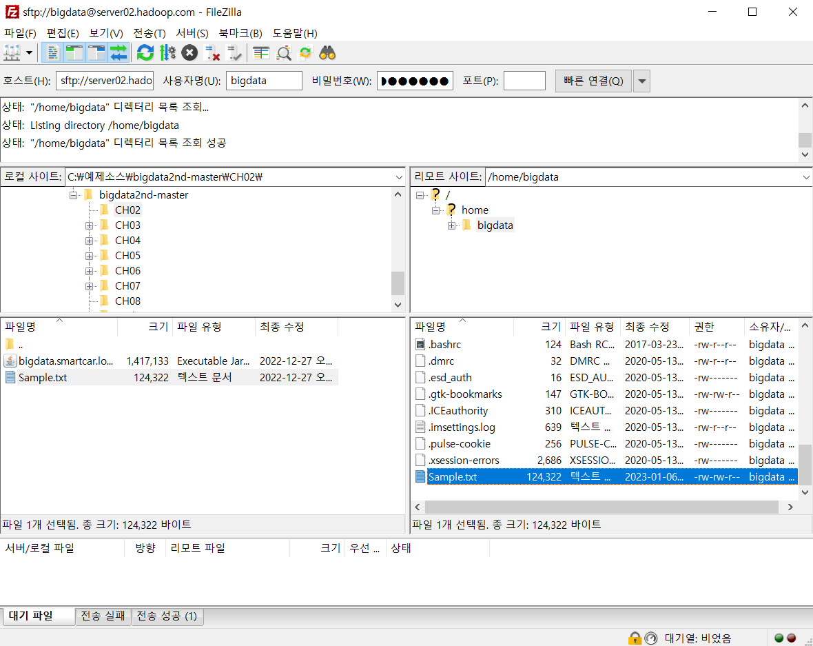 1) Filezilla로 샘플 txt 파일 -> server02 /home/bigdata 로 전송