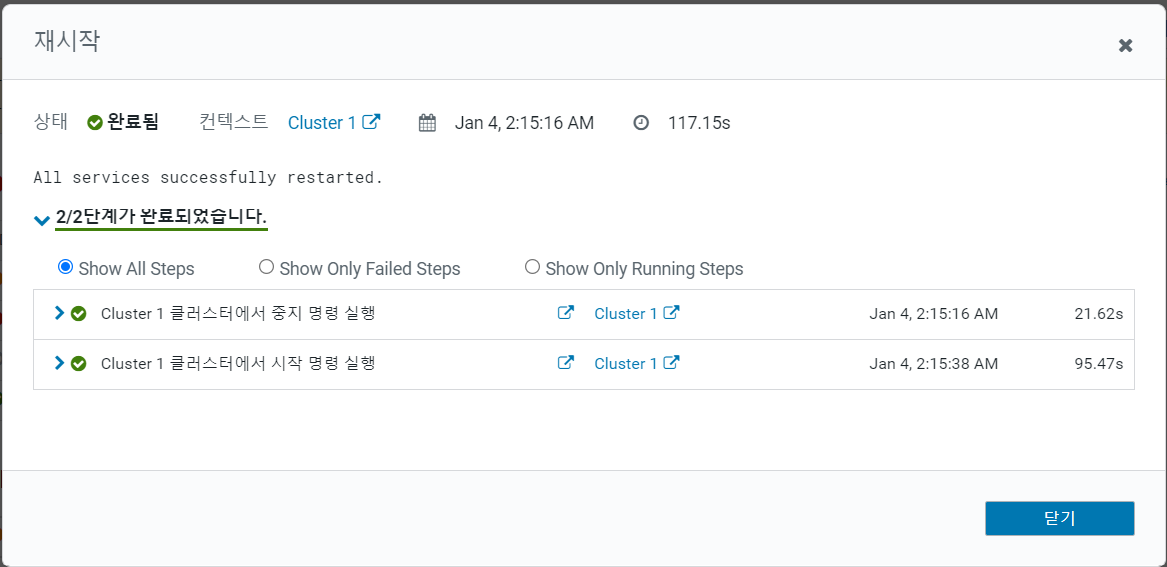 - 홈에서 [Cluster 1] - [작업] - [재시작]
