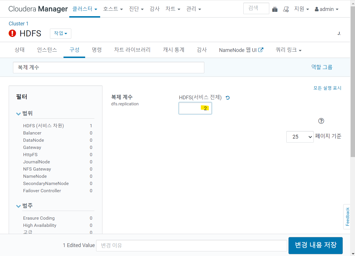 - 복제 계수를 늘리면 여러 데이터노드에 파일이 분산 저장되어 분석 작업시 성능 극대화
