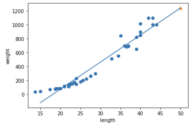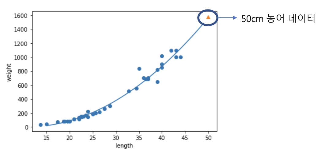 + 산점도에서 매우 작은 길이를 가진 농어의 경우 회귀 직선이 데이터를 설명하지 못함