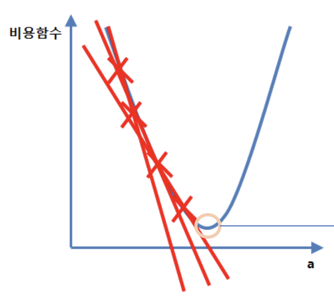 - 비용 함수의 결과값이 작을수록 선형 모델의 예측이 정확함