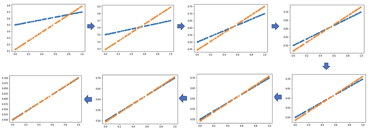 - 비용 함수의 기울기를 계속 낮은 쪽으로 이동시켜 극값(최적값)에 이를 때까지 반복하는 것