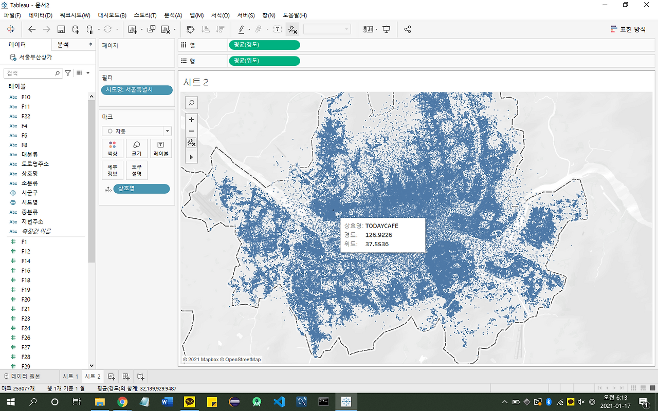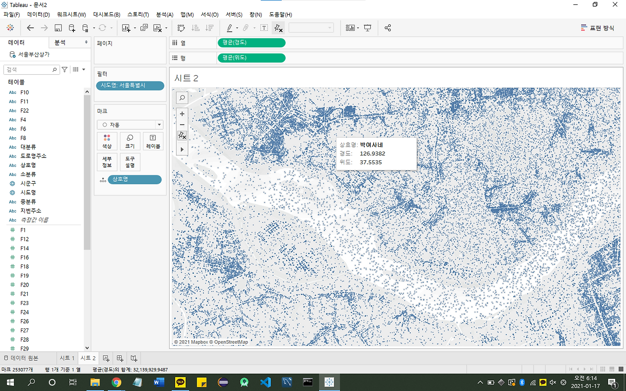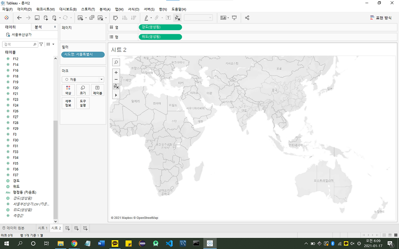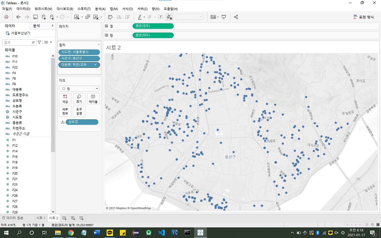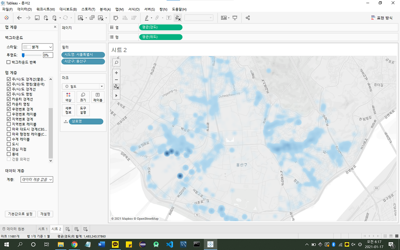 서울에 있는 데이터들만 표현한 것이다. “마크”에서 모양, 크기, 색상 등을 변경할 수 있다.