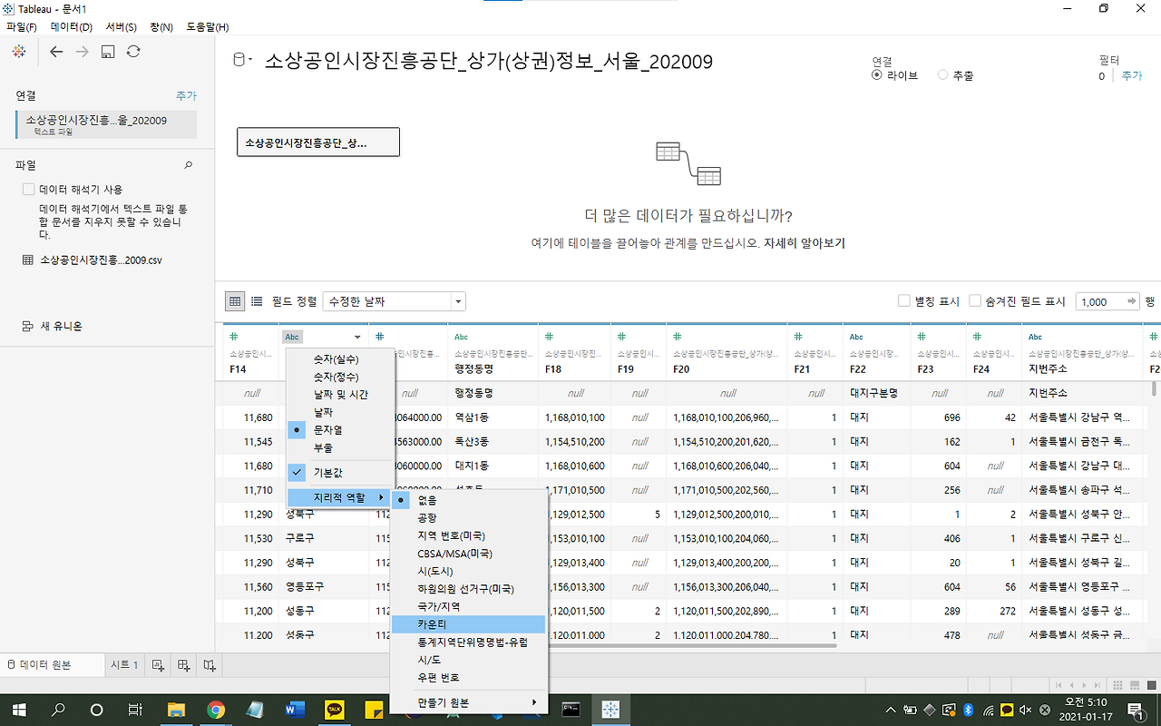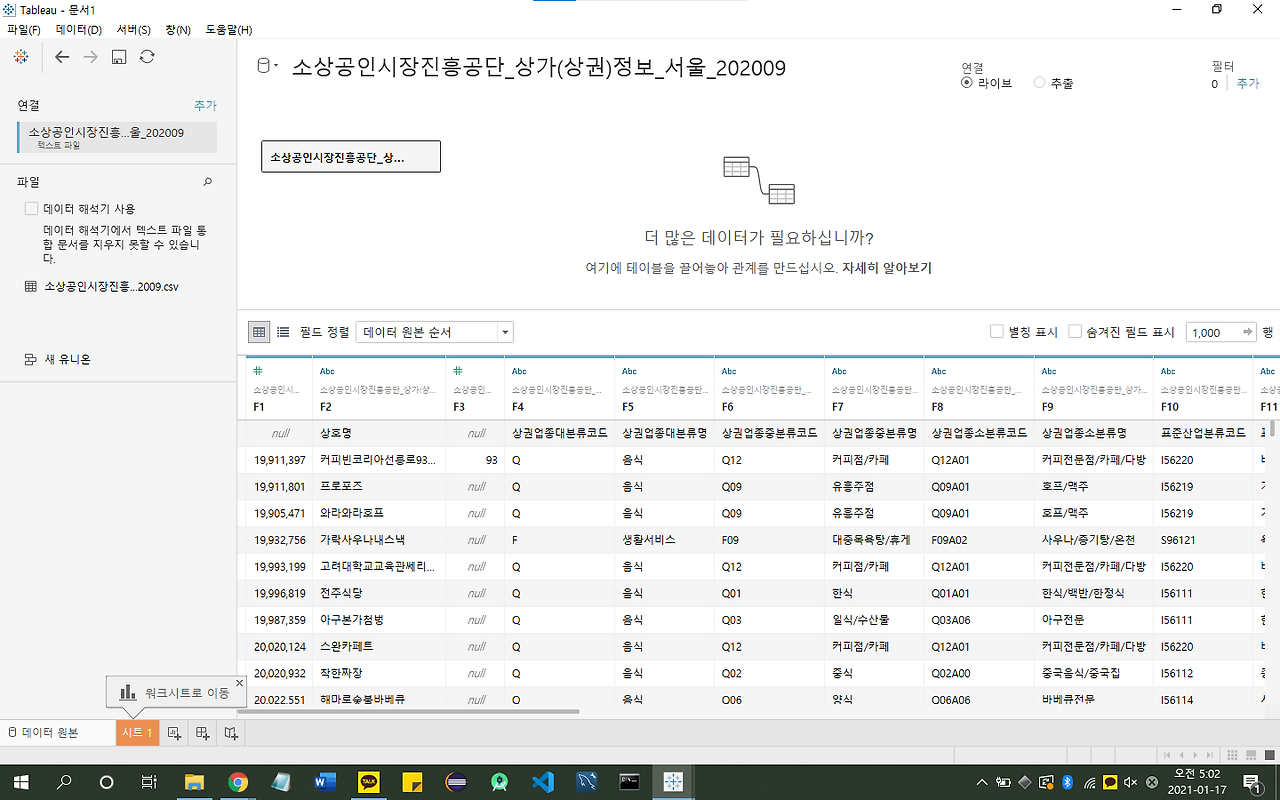 이번 실습은 공공데이터 포털에서 서울과 부산의 상가 정보 데이터를 활용했다.