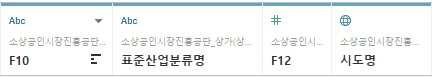 가장 위에 파란 글씨로 써져있는 것은 데이터 타입 느낌의 분류체계이다. Abc는 문자열, #은 상수, 지구 모양은 지리에 관한 것이다. 그리고, 이 파일의 경우는 분류가 F1, F2 등으로 되어있는데, 이 부분을 더블클릭해서 원하는 인덱스명으로바꿀 수 있다. 뒤에서 시각화 할 때 구분하기 쉽도록 미리 바꿔놓는 것이 좋다.