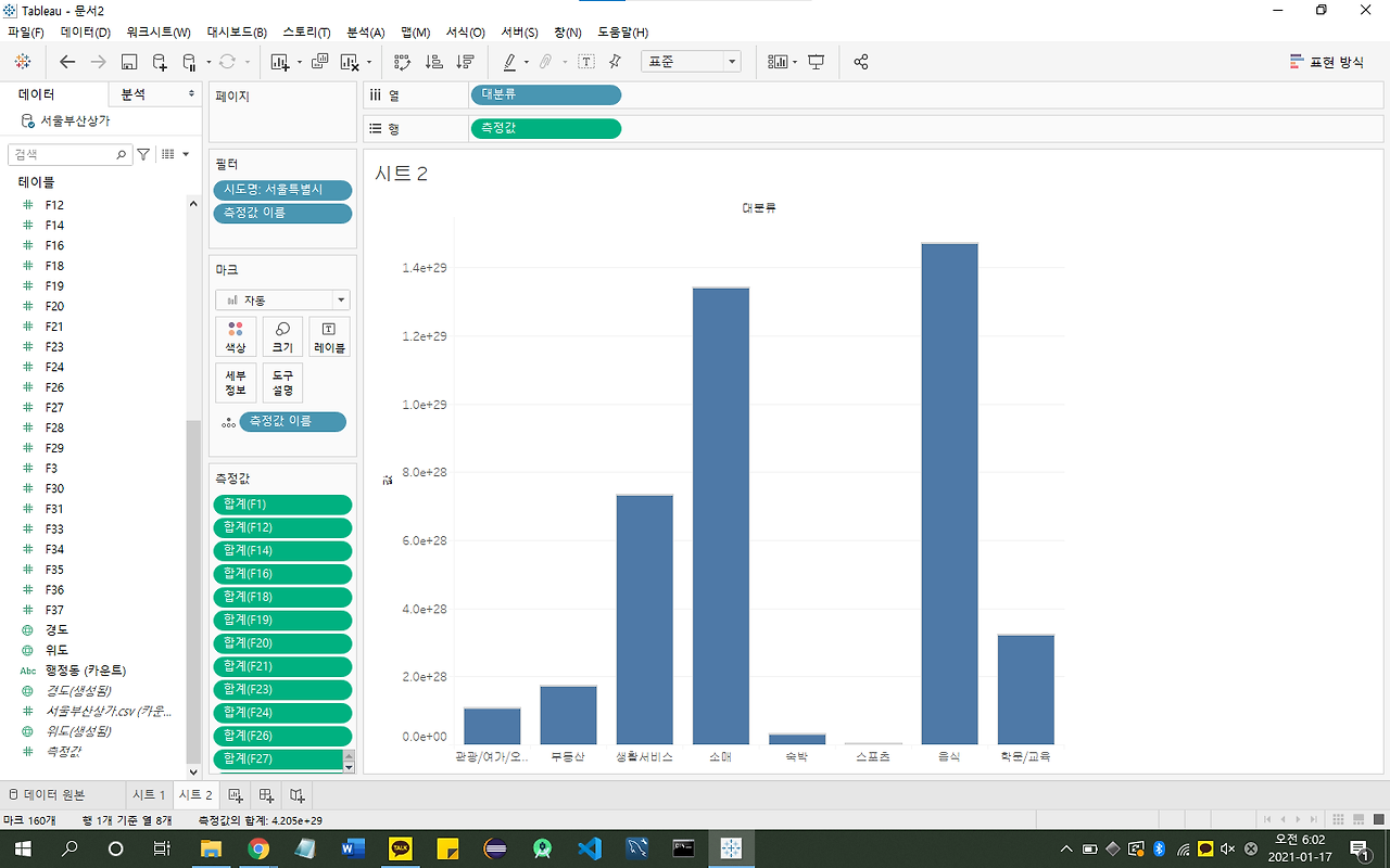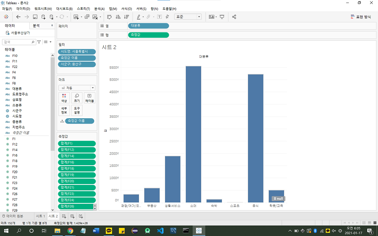 “필터” 부분에 ‘시도명’ 테이블을 가져와서 서울과 부산 중 서울만 선택했다. 표는 대분류를 열로, 측정값을 행으로 하여 대분류에 따른 데이터 수를 막대 그래프로 시각화했다. 간단하게 옆의 테이블에서 끌어와서 원하는 부분에 놓으면 된다.